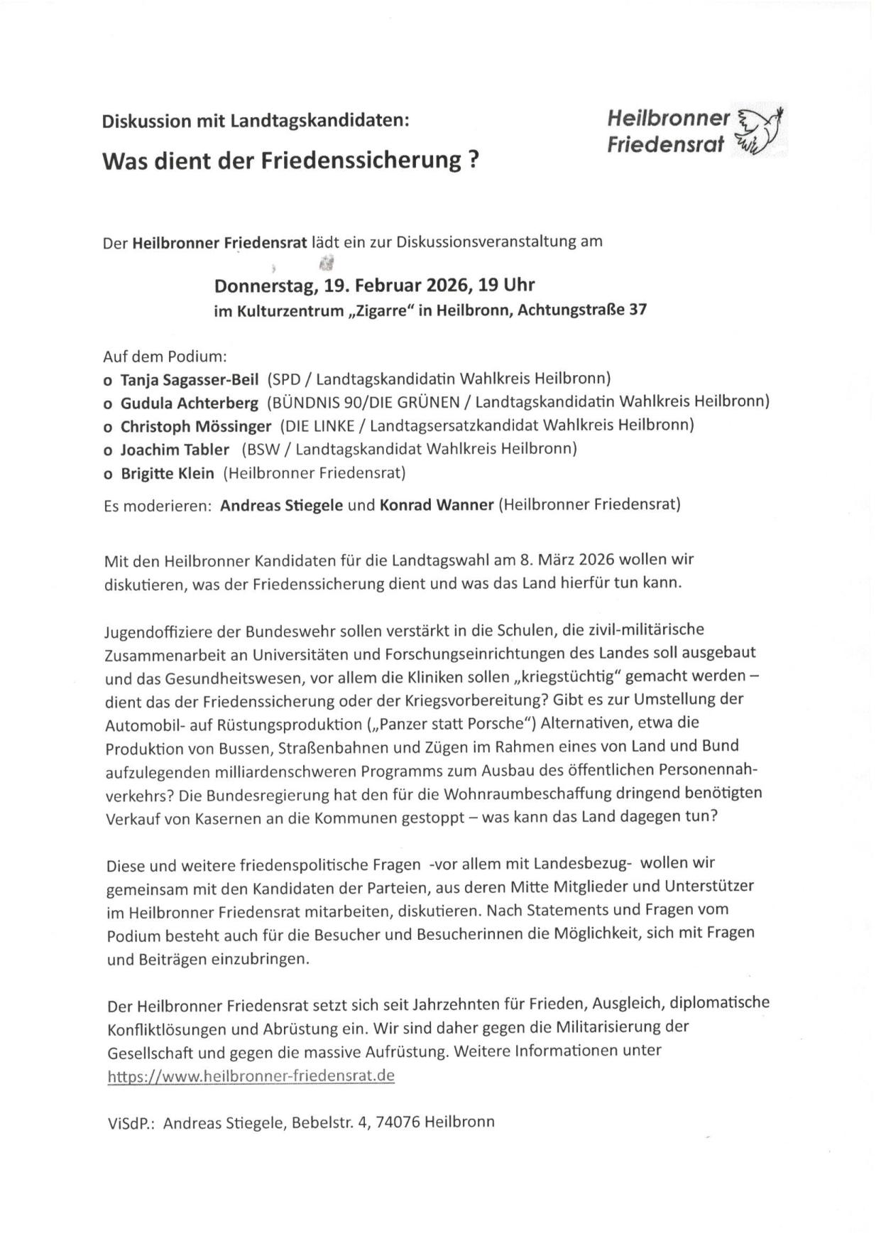 Gemeinsam mit den Heilbronner Kandidatinnen und Kandidaten für die Landtagswahl am 8. März 2026 soll darüber diskutiert werden, welche friedenspolitischen Weichenstellungen notwendig sind – und welche Rolle das Land Baden-Württemberg dabei spielen kann.
